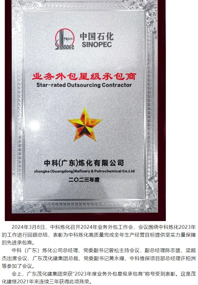 喜報:榮獲中科煉化“2023年度業(yè)務外包星級承包商”稱號
