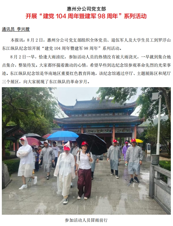 惠州分公司黨支部開展“建黨104周年暨建軍98周年”系列活動