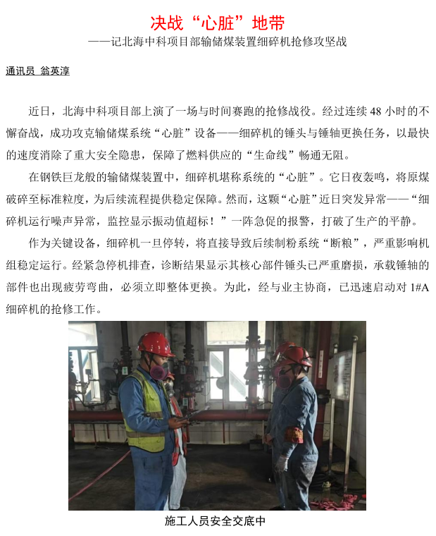 北海中科項(xiàng)目部輸儲(chǔ)煤裝置細(xì)碎機(jī)搶修攻堅(jiān)戰(zhàn)