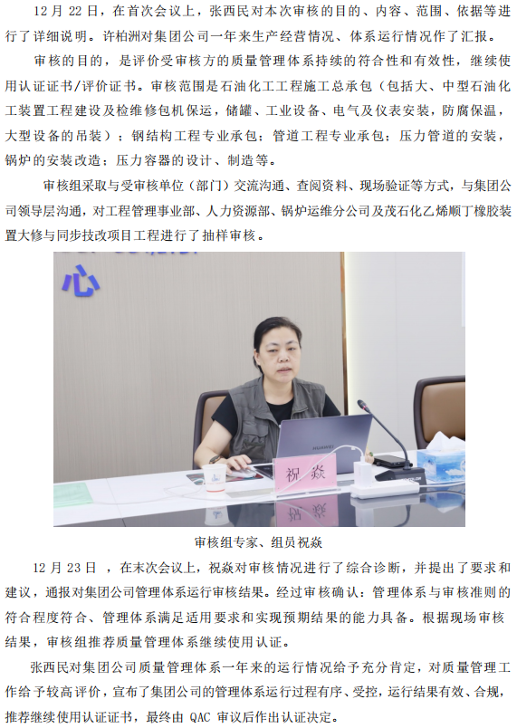 集團公司通過質量管理體系年度監(jiān)督審核
